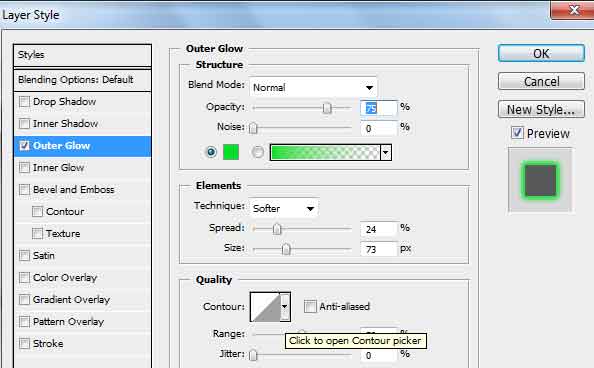 8. Pastikan layer 1 masih terseleksi. Pilih menu > Layer > Layer Style > Outer Glow.